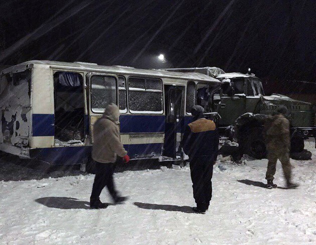 В то же время в пресс-центре штаба АТО отмечают, что из-за сложных погодных условий (метель и гололед) военный автомобиль занесло на встречную полосу и он столкнулся с пассажирским автобусом. В штабе заявляют, что в результате ДТП пострадали не 8, а четыре человека.