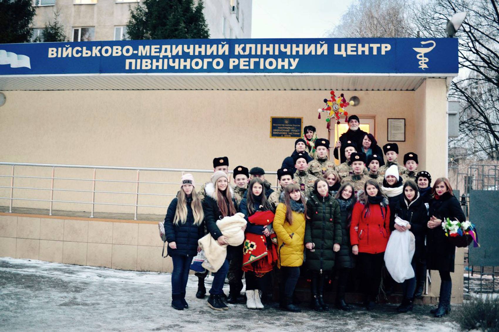 У Військово-медичному клінічному центрі Північного регіону юні патріоти побували у госпітальних палатах, де поспілкувалися із Героями-армійцями, виконали Українські національні пісні, зимові колядки, а також подарували обереги чи малюнки, підготовлені власноруч.