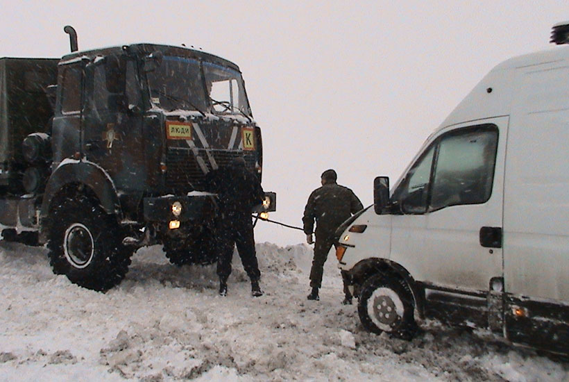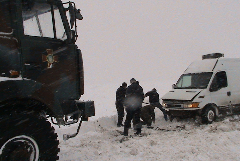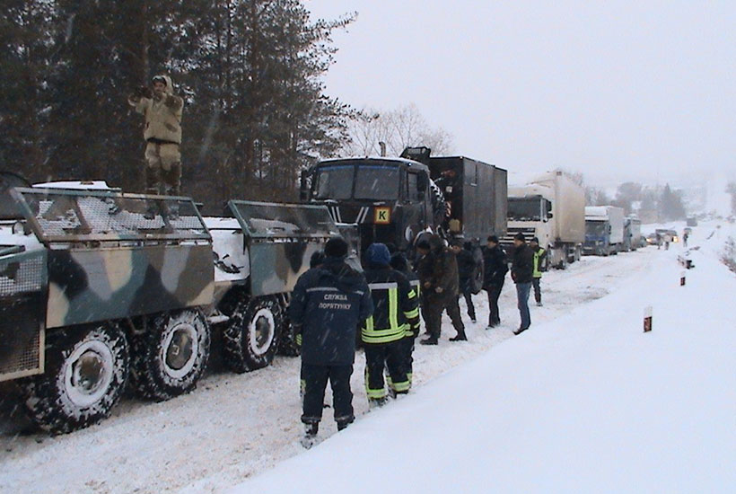 «Поряд з селищем Долина знаходиться глибокий яр, яким проходить міжнародна траса. Все засипане товстим шаром снігу. У заметах застрягли і не могли виїхати більше десяти фур. Ми їх витягали на гору, щоб вони могли рухатись далі. Для цього використовували три МАЗ і БТР», - повідомив заступник командира автомобільної роти по роботі з особовим складом старший лейтенант Ярослав Гришаков.