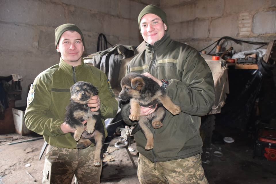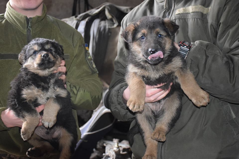 Ось такі чотирилапі клубочки нещодавно поповнили військову родину артилеристів в зоні АТО. Батько та мати цих малюків (німецькі вівчарки) сумлінно охороняють польовий табір. А поки їх мама відлучилась, пишних цуциків забавляють самі ж військові.