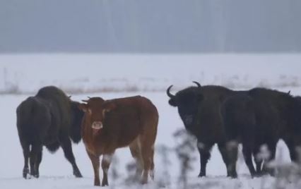 Он сфотографировал это необычное явление. Исследователь также признался, что за всю свою жизнь корову в стаде зубров он видит впервые.