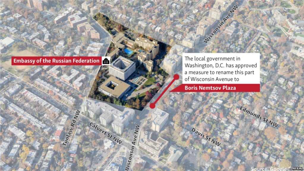Мэр Вашингтона Мюриэл Баузер подписала ранее принятый городским советом закон о присвоении площади перед посольством РФ имени Бориса Немцова.