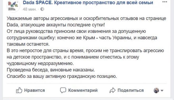 Администрация харьковского частного детсада "Dada Space" извинилась за фразу о том, что "Крым является территорией Российской Федерации". Соответствующий пост был размещен на странице креативного пространства.