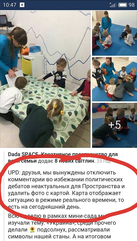 Напомним, накануне волонтер Виктория Борзова обратила внимание, что в "Dada Space" дети изучали тему "Украина", используя карты, на которых нет Крыма. Возмущенные пользователи обратили внимание администрации на это, однако официальный аккаунт детсада ответил, что "дети получают информацию об окружающем мире в режиме реального времени, а сейчас Крым является территорией РФ". Позже скандальная публикация была удалена со всех страниц "Dada Space" в соцсетях.