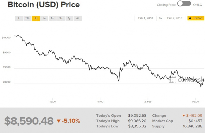 По состоянию на 9:00 биткоин торгуется на уровне 8,590 тысяч долларов за монету.