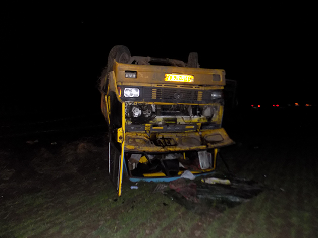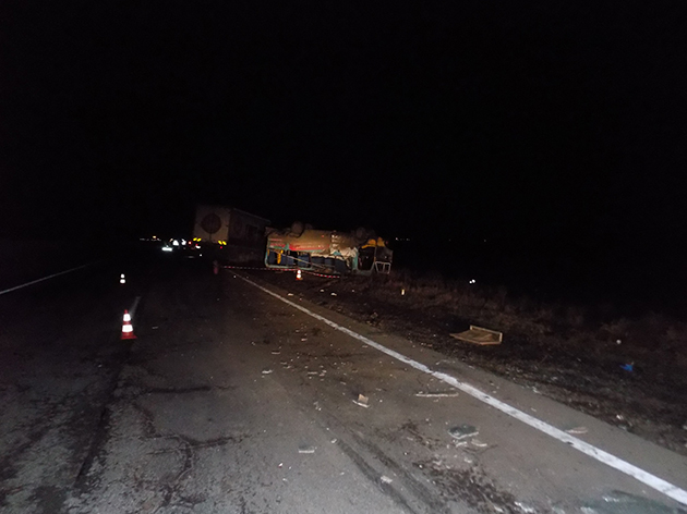 Як розповів старший слідчий відділу з розслідування ДТП обласного главку поліції Сергій Шаповал, в автобусі під час руху заглох двигун і водій зупинив транспортний засіб. В цей час позаду в попутному напрямку рухалися одна за одною дві вантажівки. Водій першого автомобіля побачив автобус, що стоїть, та прийняв ліворуч. Водій другої вантажівки не встиг зреагувати та здійснив наїзд на автобус. В результаті ДТП автобус перекинувся.