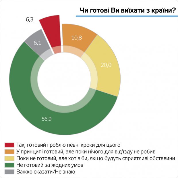 При цьому 29,1% опитаних заявили, що вони розмірковують про те, щоб виїхати з України, а 63,6% – що це не спадало їм на думку. Ще 7,3% не визначилися з відповіддю. При цьому з тих, хто має намір залишити Україну, 55% – молоді люди у віці від 18 до 29 років; 44% – від 30 до 39 років; 33% – 40-50-річні.