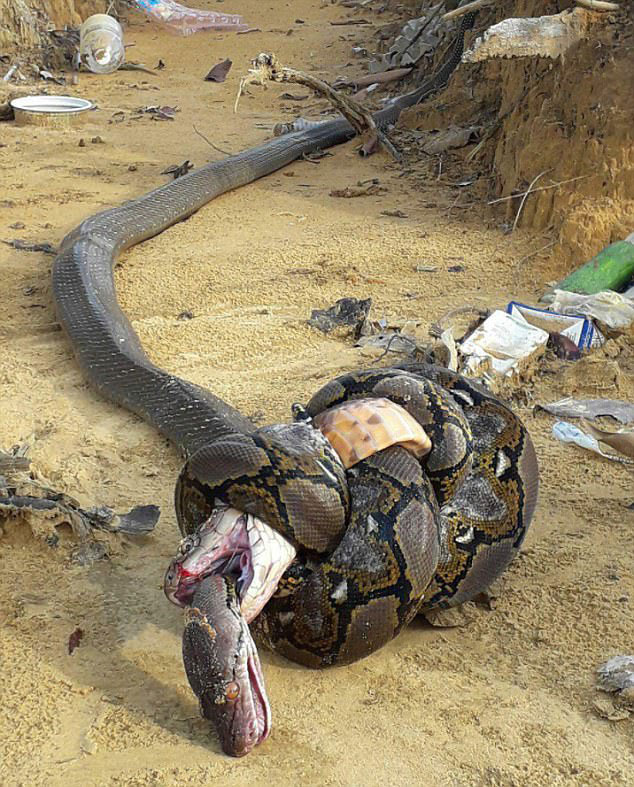 Обе змеи были мертвы, когда их нашел фотограф. На опубликованном снимке кобра сжимает зубы на шее питона, который, в свою очередь, обвивает тело противника несколькими кольцами.