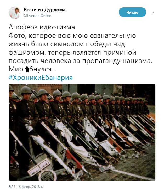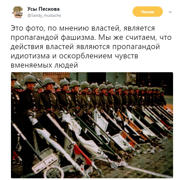 Суд признал Листова виновным в публичной демонстрации нацистской символики и назначил ему штраф в размере 1000 рублей за публикацию фото, на котором советские солдаты держат в руках знамена побежденных дивизий Третьего Рейха.