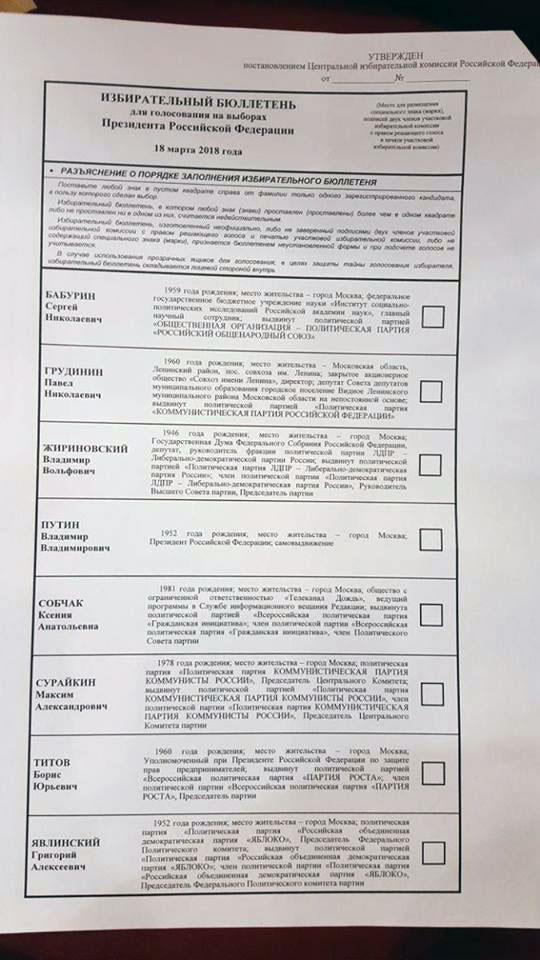 При этом бюллетень составлен в соответствии с требованиями российского законодательства: фамилии кандидатов расположены в алфавитном порядке, рядом с ними указаны необходимые сведения — где и кем работает кандидат, а также кто его выдвинул в президенты.