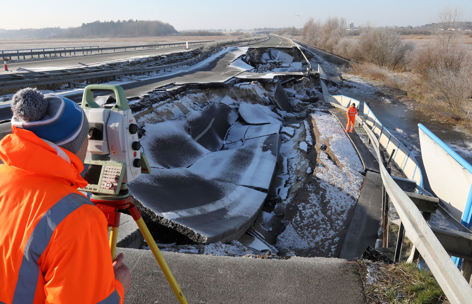 Пока на болотистом участке автобана А20 неподалеку от города Трибзес движение перекрыто в обе стороны. Осенью дыра достигала 45 метров, сейчас она увеличилась в два раза. Причина оседания до сих пор неизвестна, дорогу планируют отремонтировать только к 2021 году.