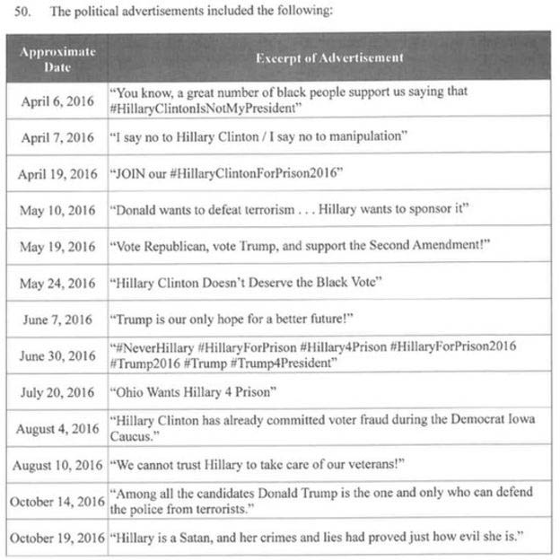 Согласно документу, они вели кампании в поддержку кандидата от республиканцев и подрывали имидж демократического кандидата Клинтон в социальных сетях и за их пределами, использовали краденные персональные данные американских граждан для создания счетов и профилей в "Инстаграме", "Твиттере", Youtube и "Фейсбуке", проникли в США под фальшивым предлогом и не намеревались регистрироваться в минюсте в качестве иностранных агентов.