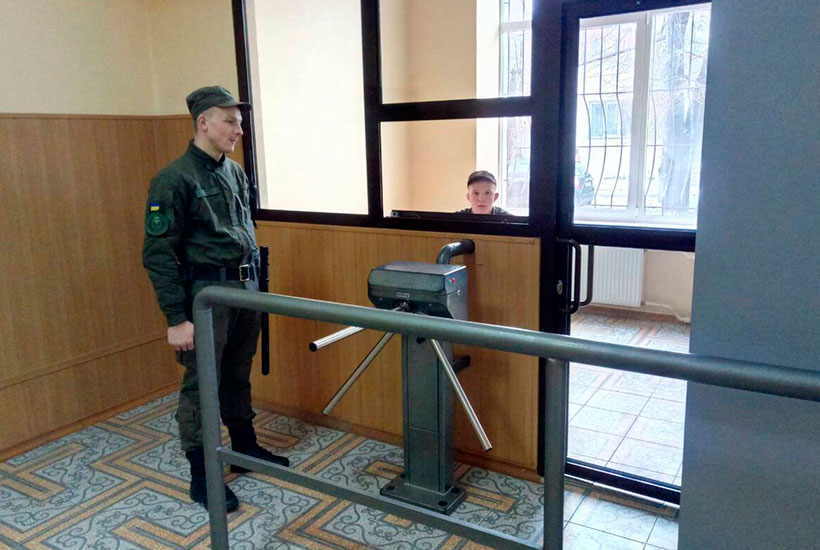 На посту охорони встановлена рамка металошукача, що попереджає пронесення до приміщень суду заборонених предметів. «Детектор спрацював вже після того, як ми запропонували чоловікові витягнути з рюкзака та кишень металеві предмети. Детально оглянувши рюкзак, я помітив згорнутий рушник, у якому лежали два ножі», – розповідає солдат Богдан Кузнецов.
