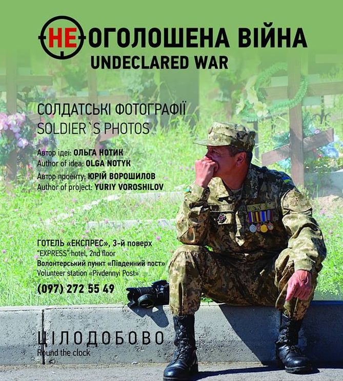 «Необъявленная война — солдатские фотографии». Это третий проект журналиста Юрия Ворошилова про российско-украинскую войну в Донбассе (предыдущие — выставка «Грузинский национальный легион — свой среди своих», презентация книги «Саур-Могила. Военные дневники»).