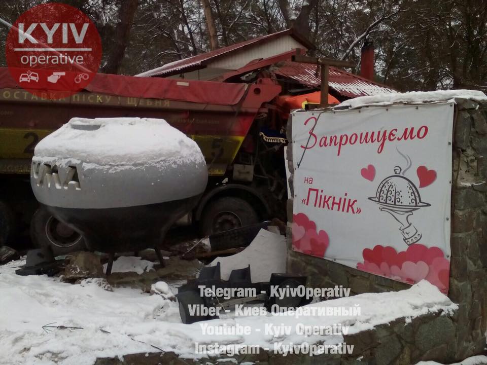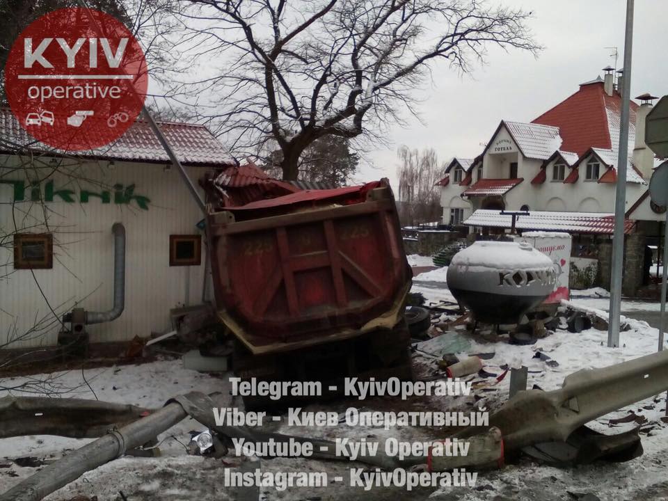Предварительно, водитель грузовика #MAN отвлекся и не увидел, что водитель седельного тягача, который ехал перед ним, остановился на красный сигнал светофора. Водитель MAN бьет по тормозам, но уже поздно - он въезжает в фуру, от чего его авто отбрасывает в ресторан #Корчма.