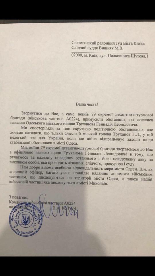 Таки не фейки, як ми воліли б сподіватись: 79-ка і командування ВМС у тій чи іншій формі вписались за Труханова. Отримали однакові заготовки, але Воронченко вирішив підредагувати текст і просто навести перелік, об'єми допомоги від одеської міськради, а комбриг 79-ї одшбр полковник Валерій Курач - ні, й підписав готовий текст із дифірамбами Труханову. Про "заготовки" - якщо орієнтуватись на викладене Бірюковим у коментарях.