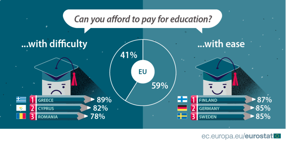 Согласно данным европейской службы статистики, жители Финляндии, Германии и Швеции людей без проблем могут платить за образование (свое или своих детей). 87%, 85% и 85% респондентов соответственно сказали, что могут свободно позволить себе оплачивать обязательные взносы, экзамены, учебные материалы, еду в столовой, школьные поездки, если речь идет об обучении детей, и компенсировать снижение рабочих часов, если обучение проходит взрослый человек. В целом лишь в 13 странах ЕС большинство жителей не испытывают трудностей с оплатой формального обучения.