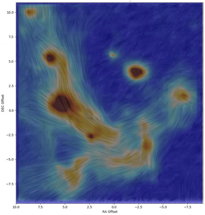 На карте четко видны две области высокой поляризации и линии магнитного поля, вдоль которых выстраивается межзвездное вещество, – горячий газ и пыль (на изображении – тонкие белые нити). Размеры изученного региона составляют около 1х1 св. года. Вблизи черной дыры пучки нитей меняют направление.