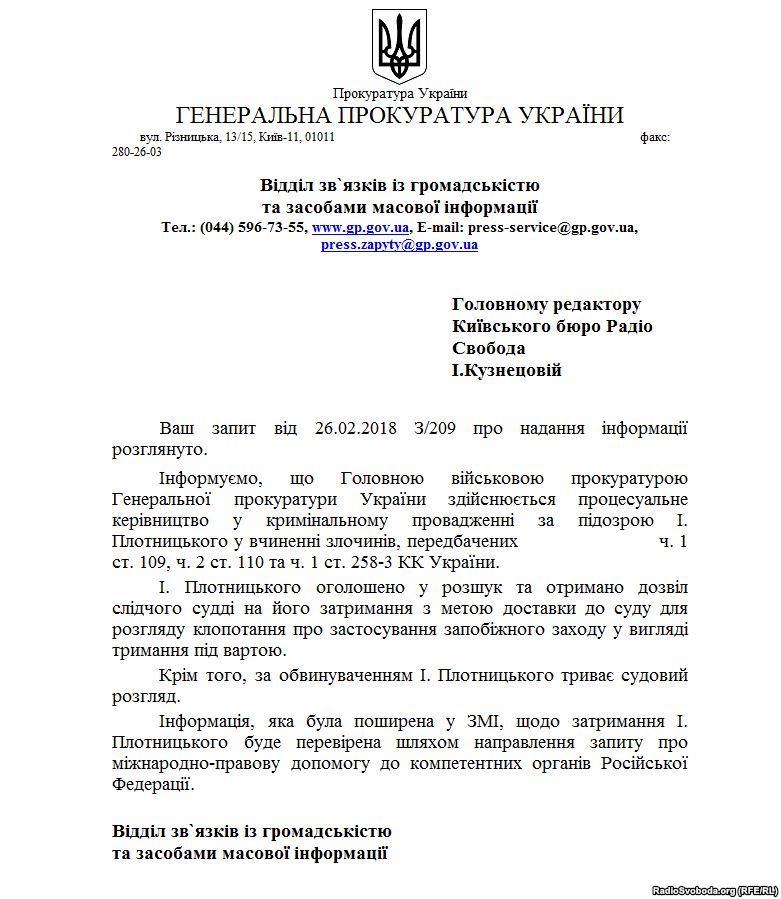Генеральная прокуратура Украины направит в Россию запрос о задержании бывшего главаря самопровозглашенной "Луганской народной республики" Игоря Плотницкого. Об этом говорится в ответе ГПУ на запрос "Радио Свобода".