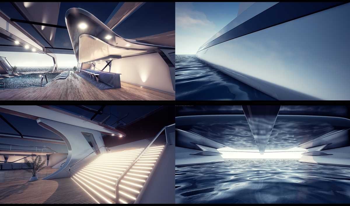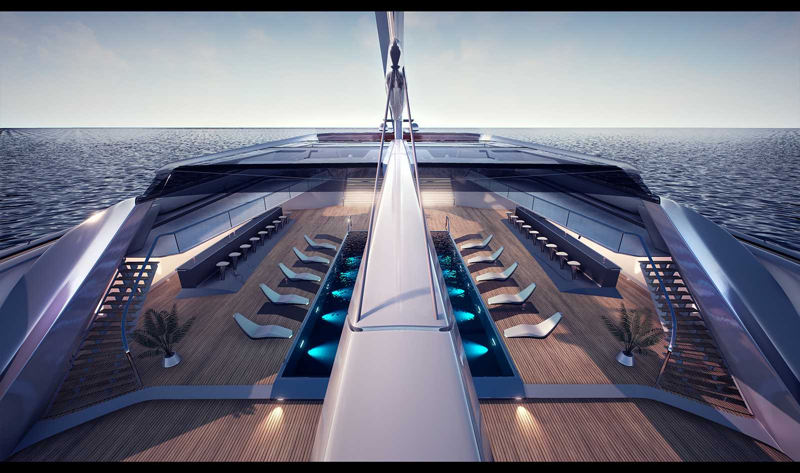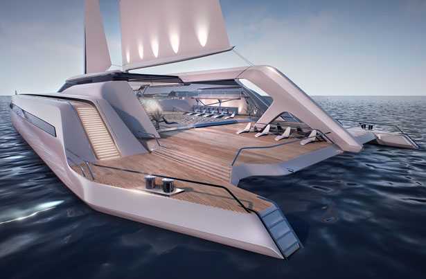 Все эти передовые технологии смешаны с уникальным дизайном. Между кормой и главной каютой дизайнеррасположил огромную палубу с великолепной открытой террасой, включающей в себя большой бассейн и несколько зон, предназначенных для отдыха во время морских путешествий. Как говорит создатель концепта, дизайн катамарана разработан для обеспечения наибольшей стабильности и эффективности на воде. Сочетание бассейна в центре с двумя симметричными частями палубы создает неповторимый стиль судна, а огромное количество других деталей интерьера и экстерьера катамарана превращают его в настоящий концепт будущего.
