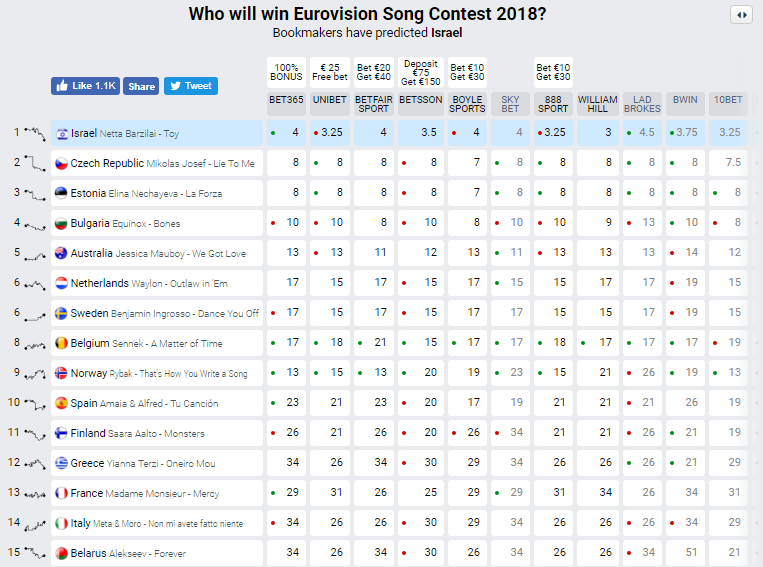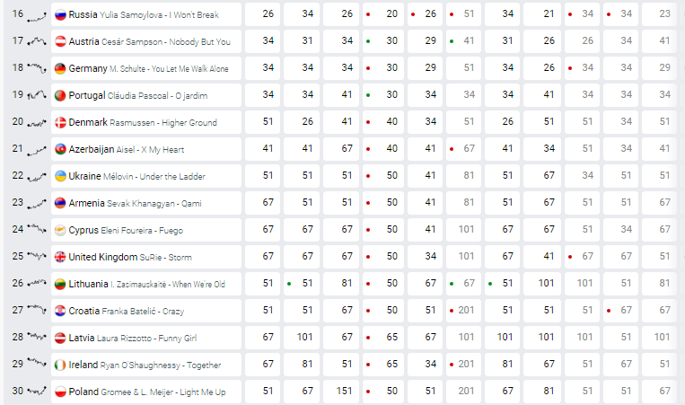 При этом украинскому певцу Никите Алексееву (ALEKSEEV), который будет представлять Беларусь, прогнозируют 15 место.