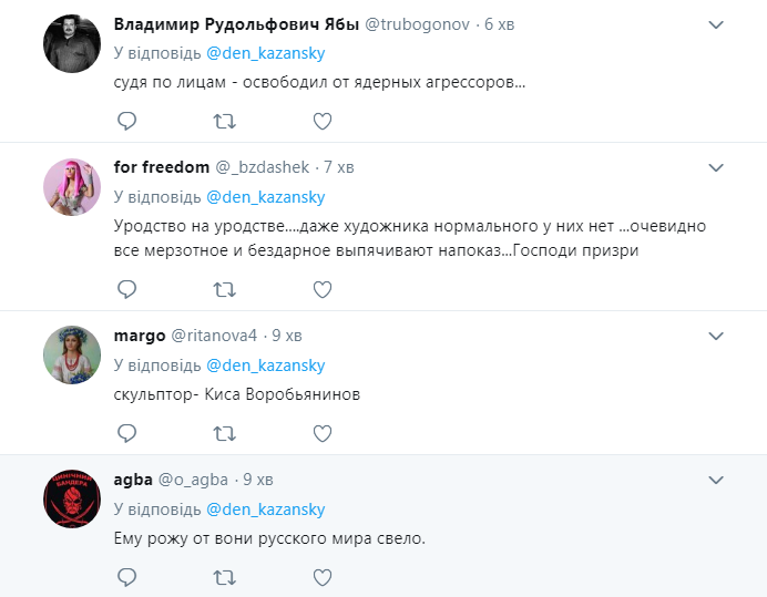 "Судя по лицам - освободил от ядерных агрессоров", "Уродство на уродстве... даже художника нормального у них нет", "ему рожу от вони русского мира свело", "просто надо было сказать: скульптору больше не наливать", - пишут комментаторы.