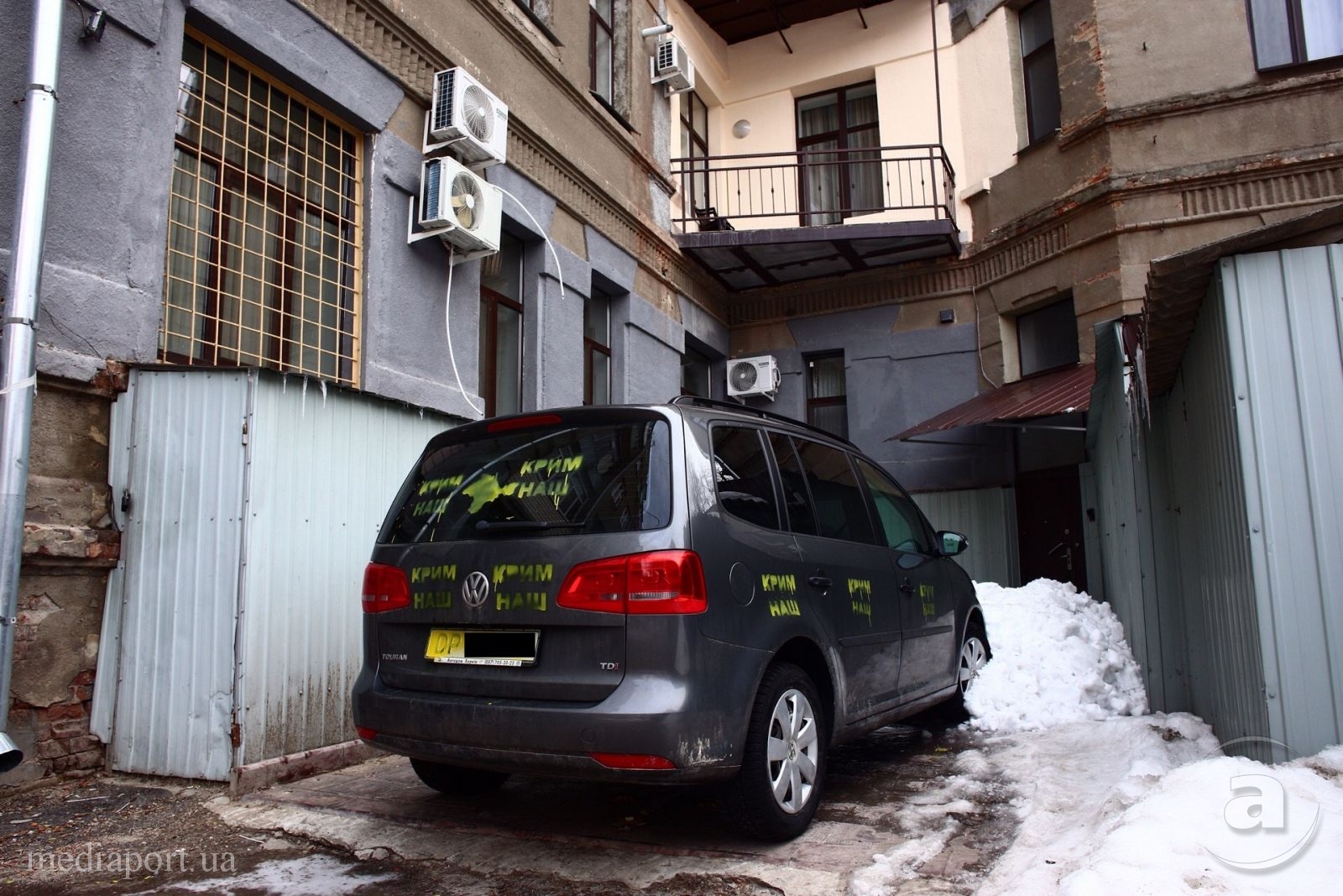 Неизвестные оставили надписи на заднем стекле и по бокам автомобиля Volkswagen с дипломатическими номерами РФ.
