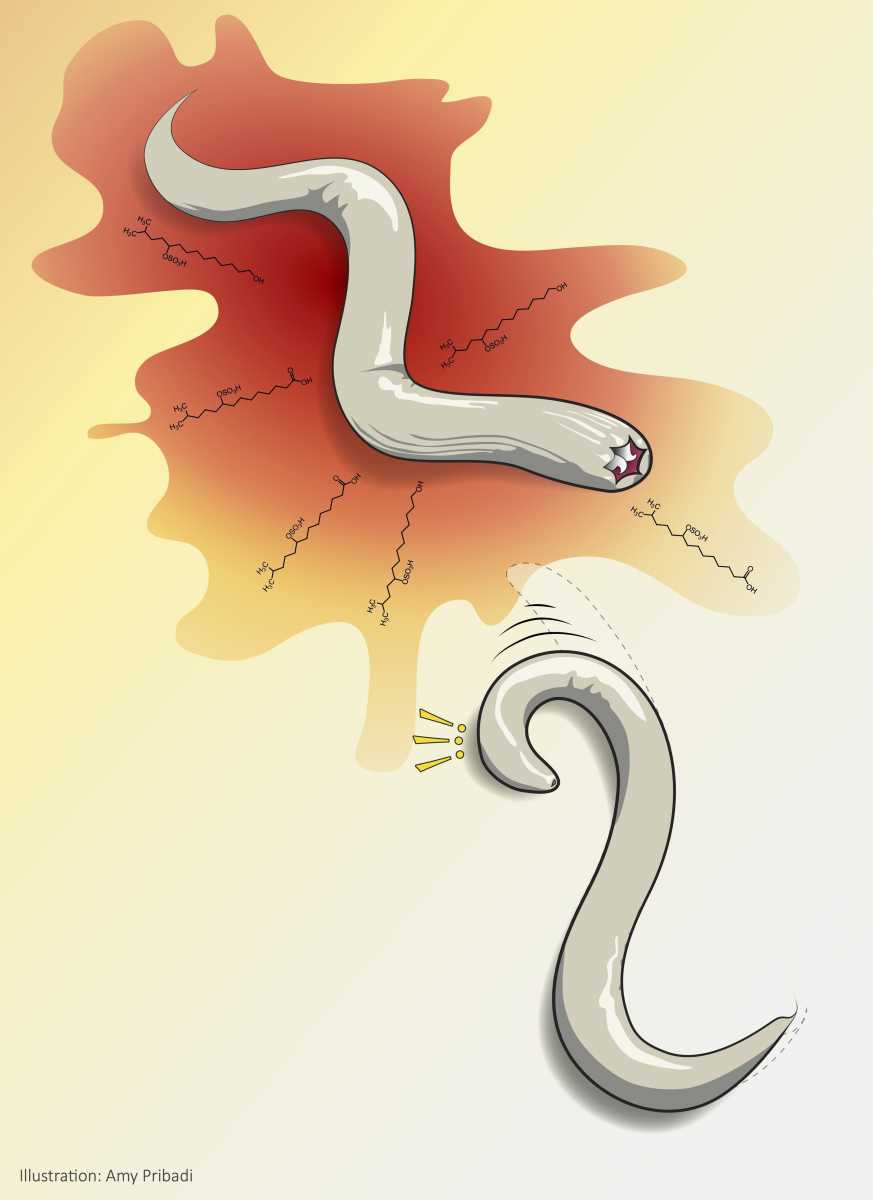 В качестве образца для изучения Чаласани и его коллеги взяли червя-нематоду Caenorhabditis elegans, нервная система которого состоит из 302 нейронов, пишет medicalxpress. Его естественным хищником является червь Pristionchus pacificus, и когда они сталкиваются, хищник выделяет особые вещества, на которые тут же реагирует C. elegans, меняя направление движения и уползая прочь. Биологи обнаружили, что эти вещества состоят из нового класса молекул, называемых «сульфолипидами», и именно они активируют резервные участки мозга нематода, которые заставляют его защищаться. Кстати, C. elegans продолжает двигаться в противоположную сторону даже после того, как химикаты испаряются, и это аналогично поведению мышей, которые начинают «беспокоиться», когда ощущают запах кошачьей мочи, даже если кошки нет поблизости.