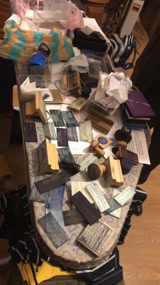 У ході документування протиправної діяльності членів вказаної групи на території Миколаївської та Київської областей в держаних установах державної міграційної служби та за місцями проживання фігурантів справи проведено більш ніж 20 обшуків, за результатами яких вилучено 75 печаток і штампів, зокрема, посольства України в Республіці Казахстан, Молдови та понад 100 незаповнених бланків державних установ, організацій, що посвідчують факти, які мають юридичне значення; 50 000 доларів США; 50 000 гривень; 252 000 російських рублів; 2130 євро; 9 одиниць зброї, без встановлених дозвільних документів; понад 150 патронів різного калібру; понад 500 грамів золотих виробів; речовину, схожу на канабіс; журнали реєстрації осіб, які не мають постійного місця проживання.