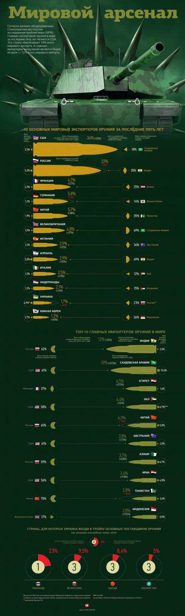 Согласно данным, обнародованным Стокгольмским институтом исследования проблем мира (SIPRI), главным экспортером оружия в мире за последние пять лет являются США. Эта страна в последние пять лет обеспечивает 34% всего мирового экспорта. А главным импортером вооружения является Индия, ее доля - 12% всего мирового экспорта в 2013-2017 годах, пишет журнал Новое Время.