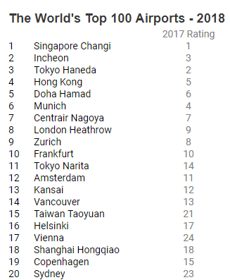 Следом за ним расположились южнокорейский Инчхон и токийский Ханэда. Замыкают топ-5 аэропорты Гонконга и Дохи.