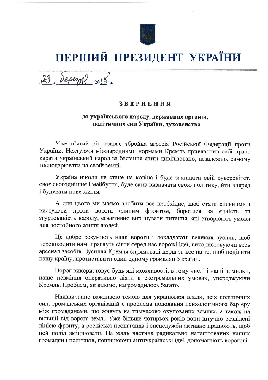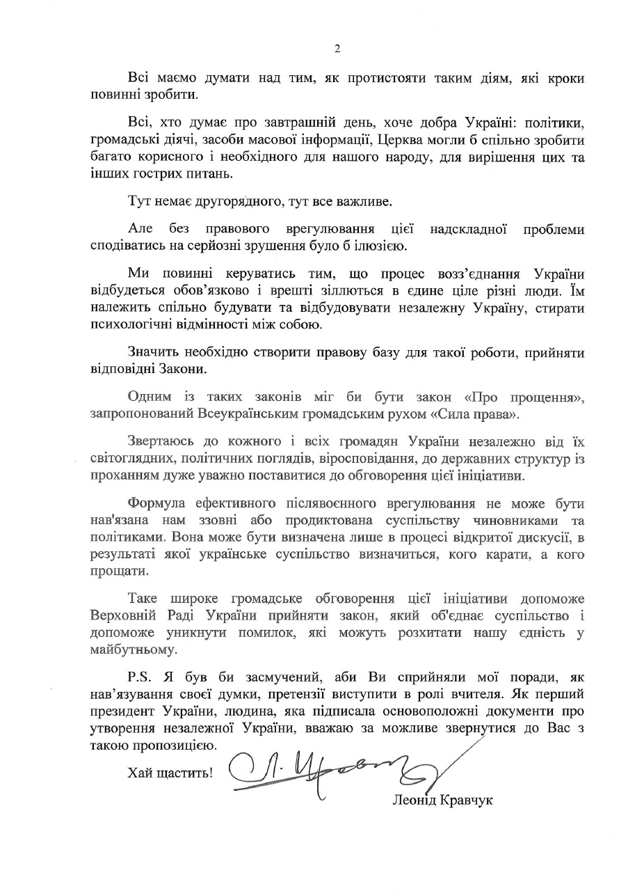 Первый президент Независимой Украины Леонид Кравчук выступил с обращением к народу Украины, госорганам и политическим силам с призывом поддержать закон "О прощении", который подготовило Всеукраинское движение "Сила права" Андрея Сенченко.