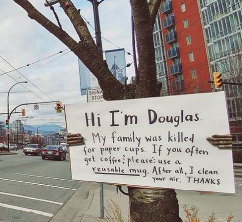 «Привет, я Дуглас. Моя семья была убита ради бумажных стаканчиков. Если вы часто покупаете кофе, пожалуйста, используйте многоразовую чашку. В конце концов, я очищаю ваш воздух. Спасибо», — гласит объявление, укрепленное на дереве на одной из улиц Ванкувера. Фото этого дерева с объявлением в деревянных «руках» разместили на странице группы Avantgardens в Facebook.