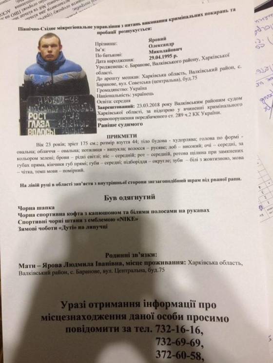 Беглец – Александр Яровой 1995 года рождения. Уроженец села В. Валковского района Харьковской области. Был арестован 23 марта Валковским райсудом по подозрению в совершении уголовного правонарушения, предусмотренного ч. 2 ст. 289 Уголовного кодекса Украины (незаконное завладение транспортным средством, совершенное группой лиц). Ранее судимый.