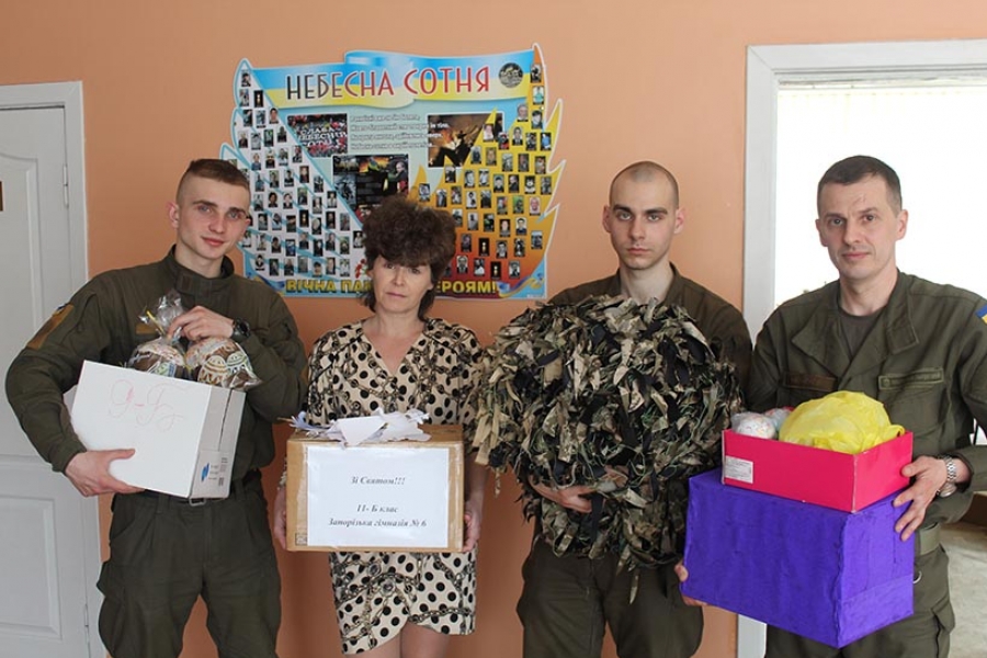 Гвардійці військової частини 3029 Національної гвардії України завітали до підшефної Запорізької гімназії №6, вихованці якої підготували для бійців чергову маскувальну сітку та Великодні ласощі, для тих, хто зараз виконує службово-бойові завдання на сході України.