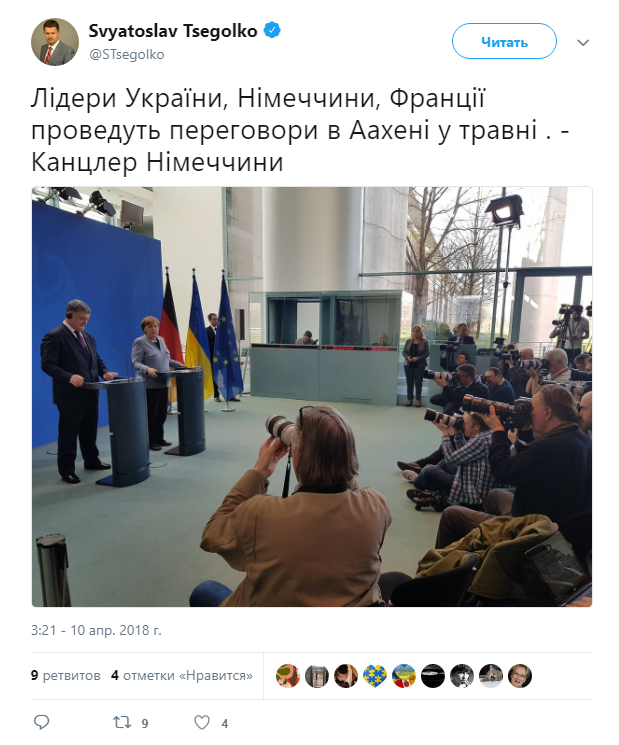 Во вторник, 10 апреля, после встречи с президентом Украины Петром Порошенко канцлер Германии Ангела Меркель заявила, что встреча лидеров "нормандской четверки" по Донбассу состоится в Аахене (Германия).