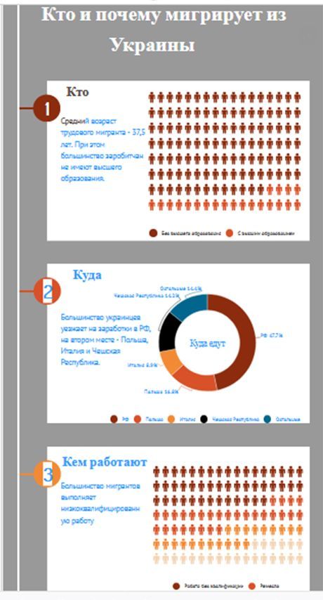 Еще одна проблема, отмечает старший научный сотрудник Института демографии и социальных исследований Лидия Ткаченко, львиная часть трудовых мигрантов работает всего несколько месяцев в году, а после возвращаются домой и тратят заработанное. В результате многие просто отвыкают от постоянной работы и теряют интерес к украинскому рынку труда.