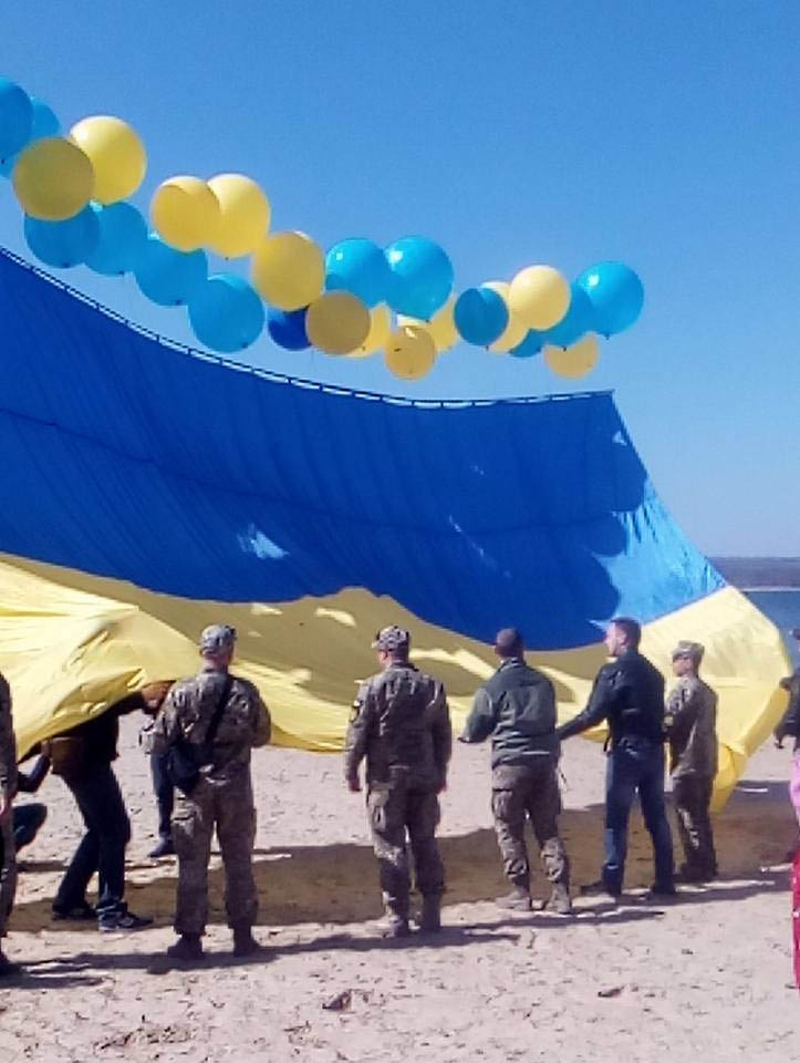 Після завершення приготувань, величезний Державний прапор України, прикріплений до легких гелієвих куль розгортають на березі місцевого водосховища. Під державний гімн України та оплески учасників акції прапор піднімається у небо та бере курс на Горлівку.