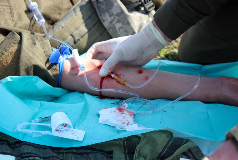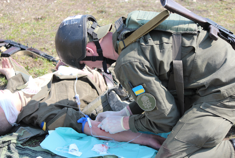 «За легендою у нас був один боєць з тяжкими пораненнями і другий з більш легкими. Тяжкопораненому допомогу надавав штатний фельдшер, іншому – звичайний військовослужбовець із складу відділення. В ході надання допомоги пораненим було проведено інфузійну терапію із використанням фізичного розчину і 6-відсоткового препарату ГЕК. Також для запобігання гіпотермії використовувалось термоковдра», — коментує інструктор з тактичної медицини старший сержант Максим Кириченко.