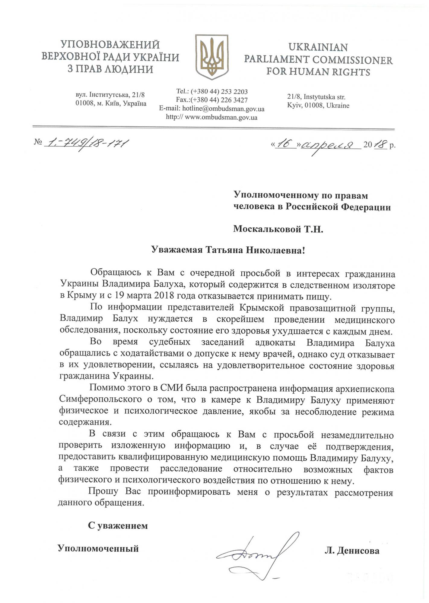 «У зв’язку з цим, - наголошує Уповноважений у листі до російського Омбудсмена, - звертаюсь до Вас з проханням перевірити вищевикладену інформацію і у випадку її підтвердження, надати кваліфіковану медичну допомогу Володимиру Балуху, а також провести розслідування стосовно фактів фізичного та психологічного тиску по відношенню до нього. І прошу проінформувати мене про результати розгляду даного звернення».