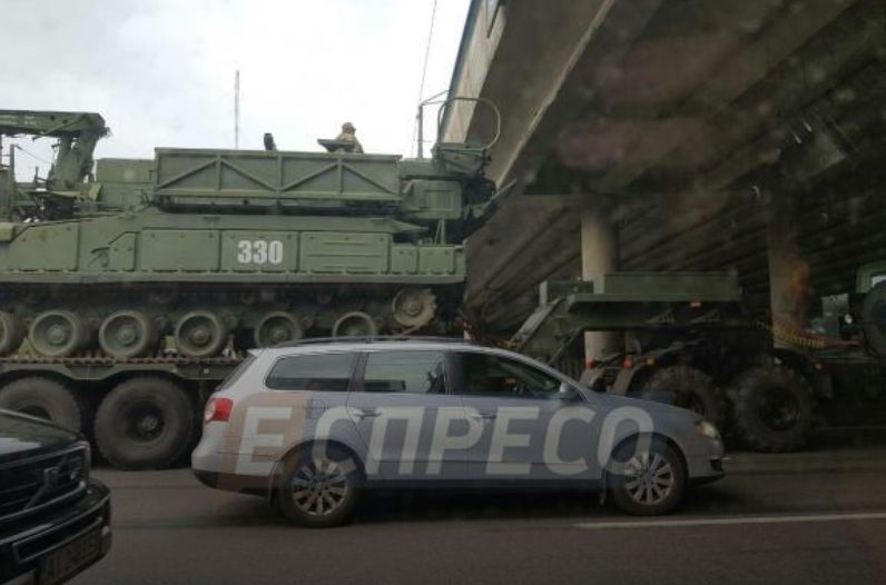 У Києві тягач, який перевозить військову техніку, на зміг проїхати під одним із шляхопроводів