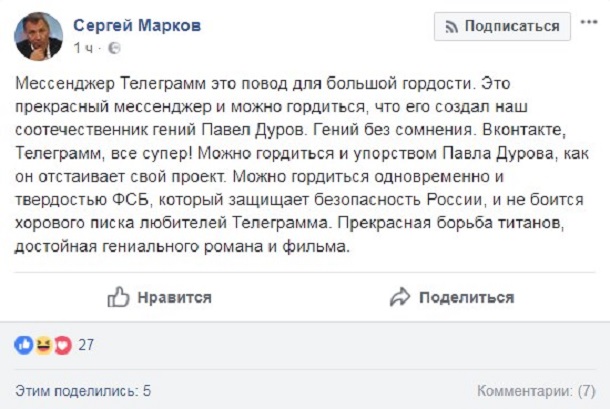 "Мессенджер Телеграмм это повод для большой гордости. Это прекрасный мессенджер и можно гордиться, что его создал наш соотечественник гений Павел Дуров. Гений без сомнения. Вконтакте, Телеграмм, все супер! Можно гордиться и упорством Павла Дурова, как он отстаивает свой проект. Можно гордиться одновременно и твердостью ФСБ, который защищает безопасность России, и не боится хорового писка любителей Телеграмма. Прекрасная борьба титанов, достойная гениального романа и фильма", - написал он.