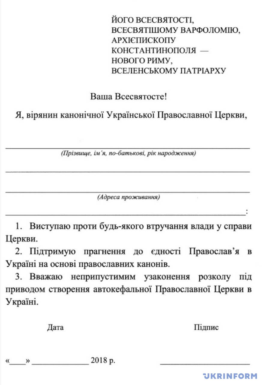 Согласно сообщению, на епархии УПЦ МП поступили бланки стандартизованного письма к Вселенскому патриарху. Прихожан склоняют обратиться к патриарху с протестом против создания Единой поместной церкви на основе "раскольнических группировок УПЦ КП и УАПЦ".