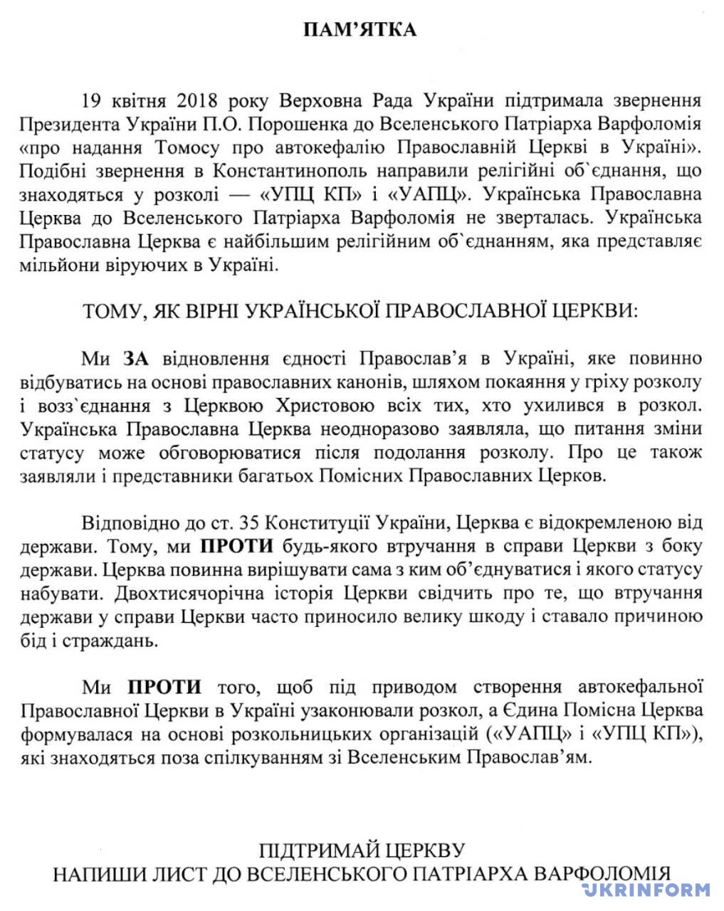 Для срыва предоставления томоса (указа - ред.) вместе с шаблоном письма верующим выдают памятку, в которой их убеждают, что предоставление автокефалии УПЦ КП и УАПЦ является нарушением их конституционных прав.
