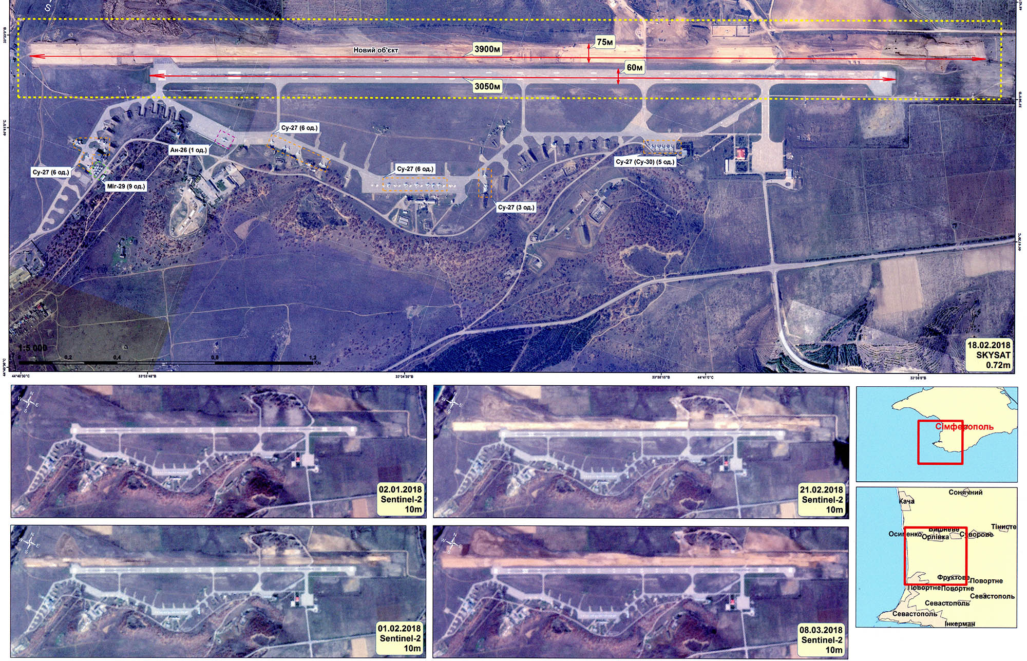 Указывается, что новая полоса расположена параллельно уже существующей взлетно-посадочной полосе и будет иметь длину около 4 тысяч метров. На строительной площадке зафиксировано около 60 единиц строительной техники и вероятный цементный мини-завод. Кроме того, на стоянках аэродрома зафиксированы девять самолетов МиГ-29, один - Ан-26, 26 - Су-27, а также почти 100 единиц автомобильной и спецтехники.