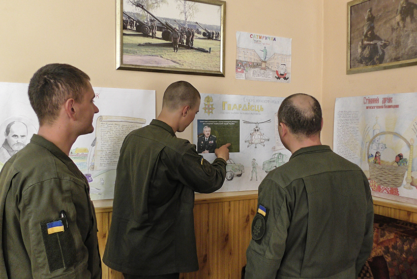 «Коли я малював, будучи цивільною людиною, картини були на тематику природи, людей, які кожен день метушяться в пошуках щастя, або зображав тварин і звірів. Прийшовши на строкову службу в Національну гвардію, у мене було відкрито нове джерело натхнення, яке дало мені поштовх на творчість. Наприклад, перебуваючи на навчальному зборі, по-нашому «КМБ» (курс молодого бійця), з часом розуміючи, що таке Національна гвардія України, я намалював на будівлі Навчального центру козака з шаблями з лівого боку та з правого сучасного нацгвардійця з гвинтівкою «Форт». Цим малюнком хотів показати те, що протягом століть українські хлопці залишаються мужні, сильні, відважні боронячи нашу неньку від ворога», - розповів солдат Кирило Лиходід.