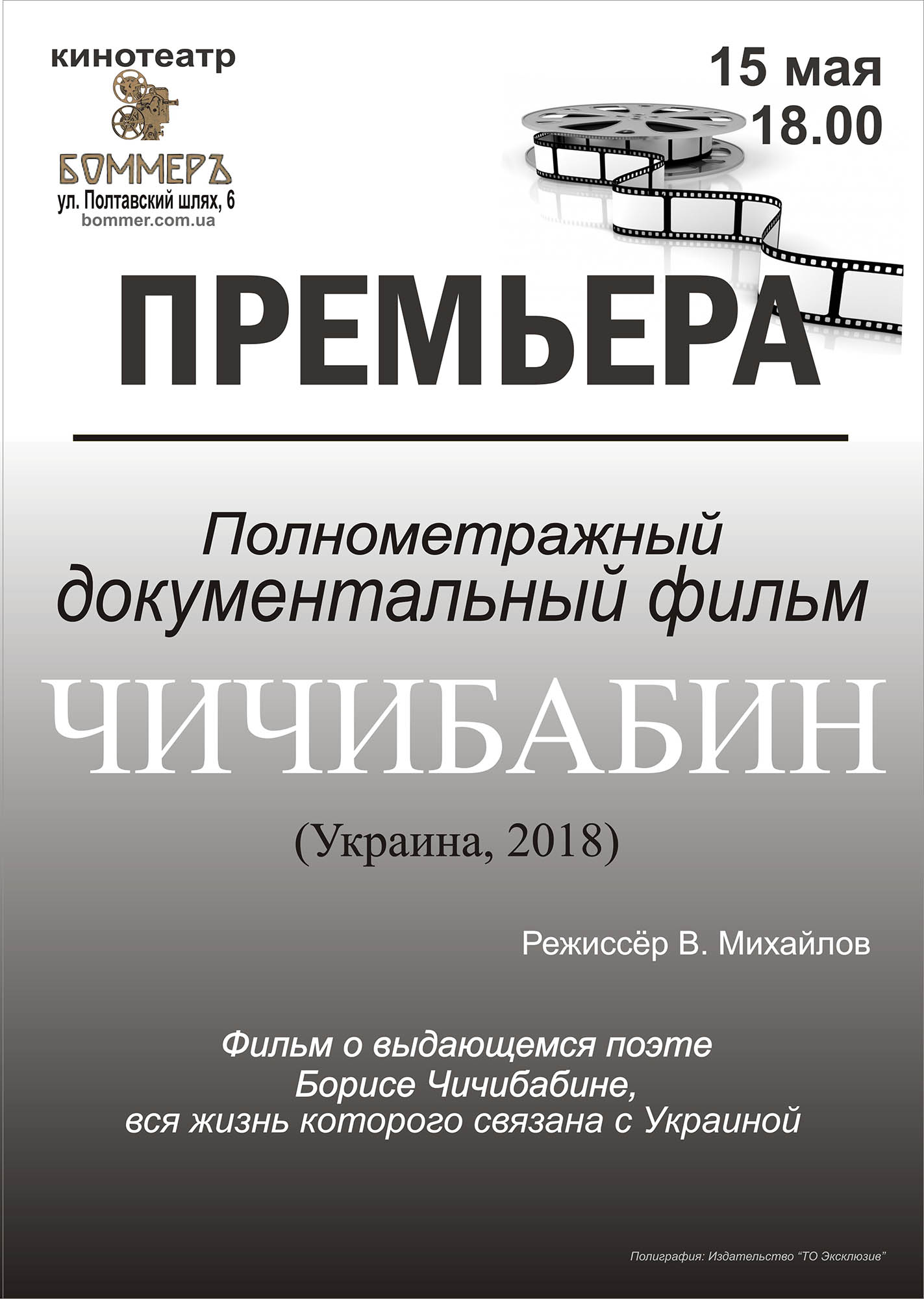Фильм «Чичибабин» - полнометражная документальная лента о выдающемся поэте Борисе Чичибабине, вся жизнь которого связана с Украиной. В фильме представлены объёмный фото- и видеоматериал, воспоминания вдовы поэта, друзей и участников легендарной литературной студии, которой руководил Чичибабин. Монтаж картины сделан в оригинальной форме: поэт как бы подтверждает или дополняет воспоминания своих современников.