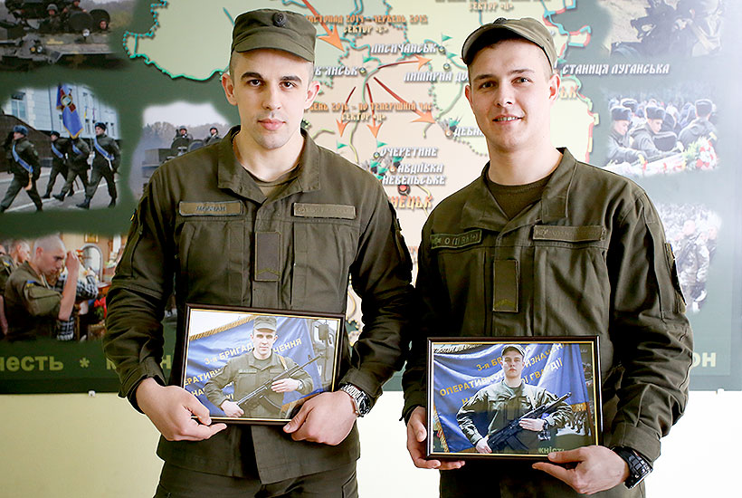 «Я тому і залишаюся у резерві Нацгвардії, бо це найменше, що я можу зробити, щоб не втрачати зв’язок із своїми друзями і частиною", — зізнається юнак тримаючи в руках фото, де він стоїть на фоні розгорнутого бойового прапора частини.