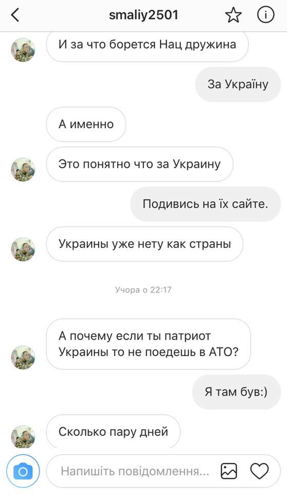 Каже, що «бандеровцы отбросы общества», потім починає мені розповідати, що «України вже немає як держави»! Я, чесно кажучи, не знаю, як реагувати. Мені дуже неприємно, що люди з антиукраїнськими поглядами служать в ЗСУ. Я сподіваюсь, що невеличкий медійний скандал допоможе керівництву прийняти правильне рішення — виключити цього засранця з лав ЗСУ!Особливий «привіт» хочеться передати батькам цього хлопця. Я сподіваюсь, що ваш син знайде собі достойне місце вдома на городі. Нехай ходить пасе корів та картоплю копає. На жаль, це його максимум...