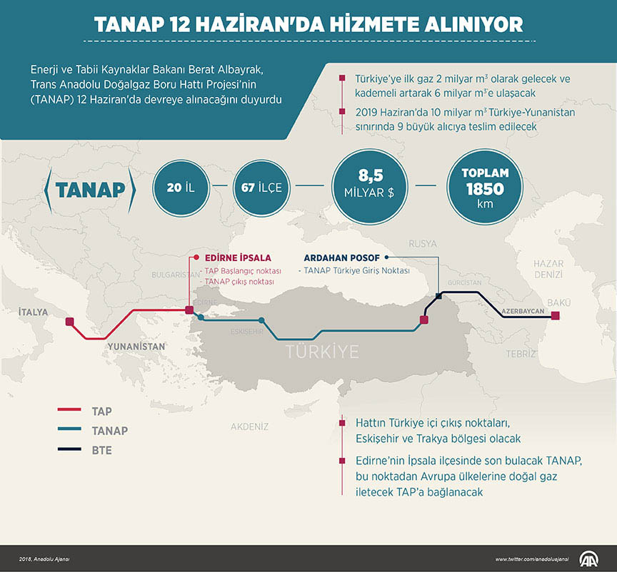 «Ввод TANAP в эксплуатацию — залог продолжения активной энергетической политики Анкары», — сказал он. В церемонии запуска нового газопровода примут участие президенты Турции и Азербайджана — Реджеп Тайип Эрдоган и Ильхам Алиев, отметил он.